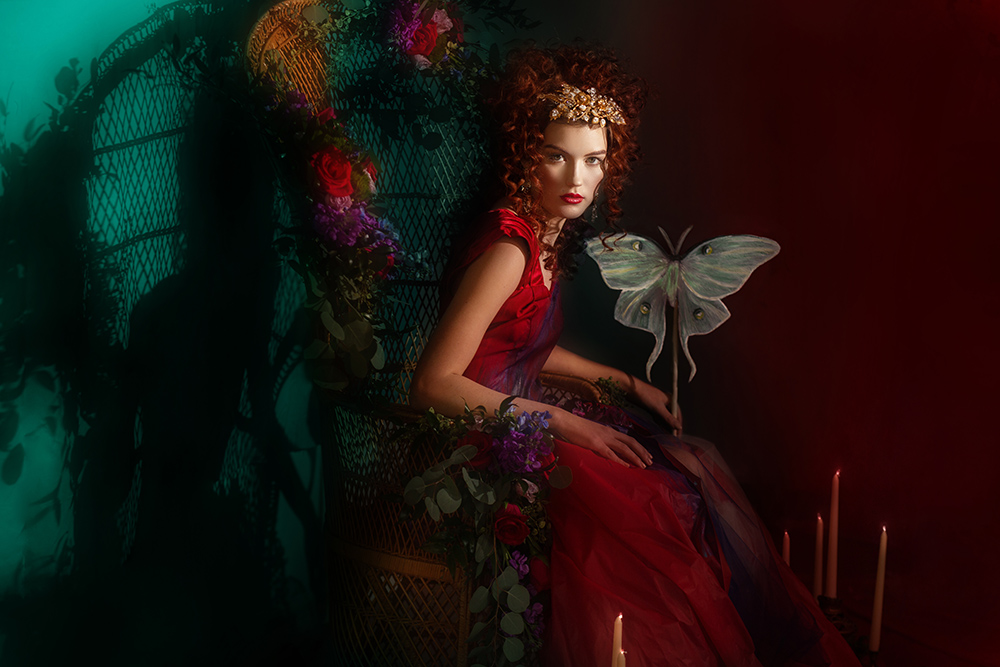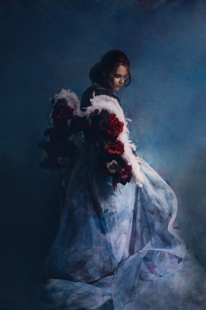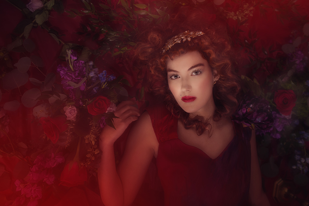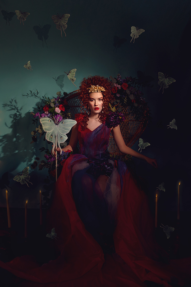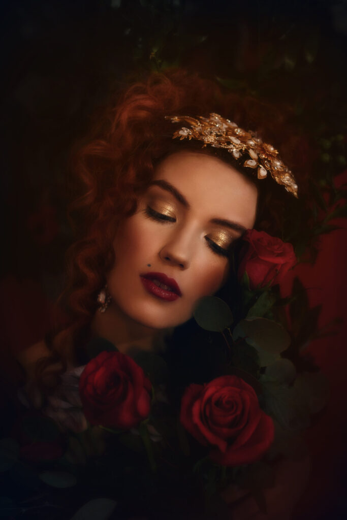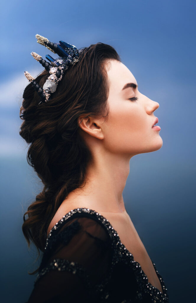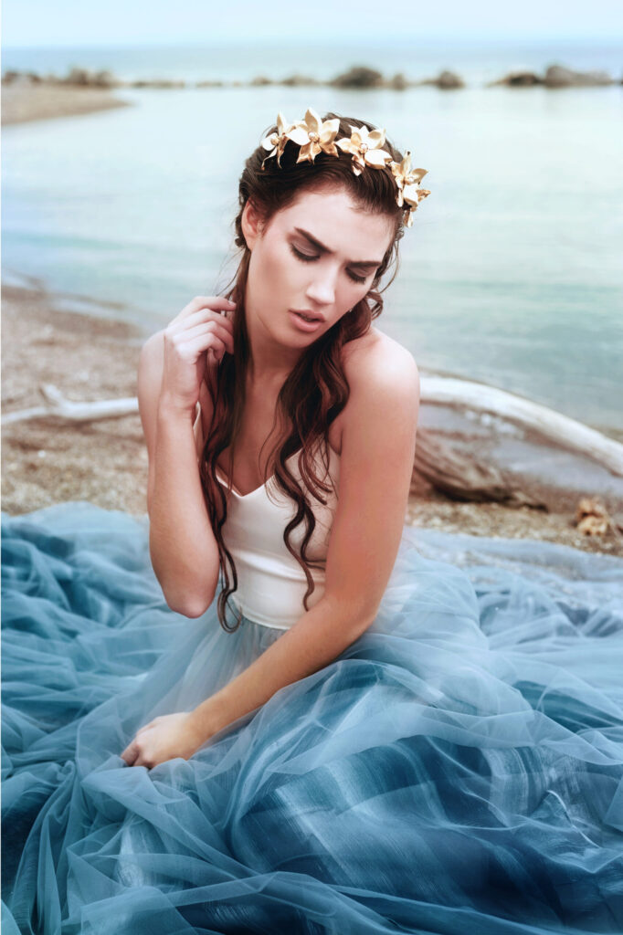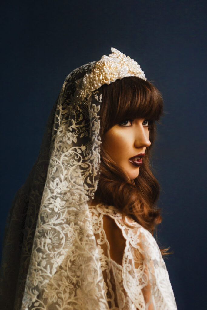 Credits- Photographer- Angie Candell Hair Stylist- La Pomponnee Beauty Artisans Makeup Artist- Brazil Raine Model- Bella Davisson Gown- Chantel Lauren Accessories- Kata Banko Couture
